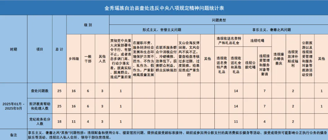 2025年1-9月金秀瑶族自治县查处违反中央八项规定精神问题25起